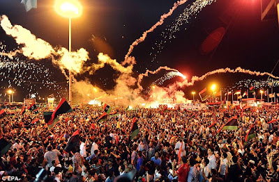For those who like spotting connections between things, keep your eyes peeled for the 7-7 banners being waved about by the anti-Gaddafi protesters in the news footage below, who numbered among them none other than Guma El Gamaty, now the British co-ordinator for the rebel interim National Council of Libya. El Gamaty and his cronies have been a long time waiting for the NATO/US/UK/French/Italian/CIA/MI6 sponsored and supported 'rebels' to launch their murderous coup attempt in Libya.